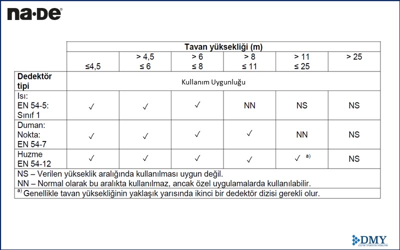 TS CEN/TS 54-14 standardına göre ışın tipi duman dedektörleri, özellikle 11 metreden yüksek tavanlı mahallerde kullanılmalıdır. 7–11 metre arasındaki yüksekliklerde ise optik duman dedektörlerine alternatif olarak tercih edilebilir.