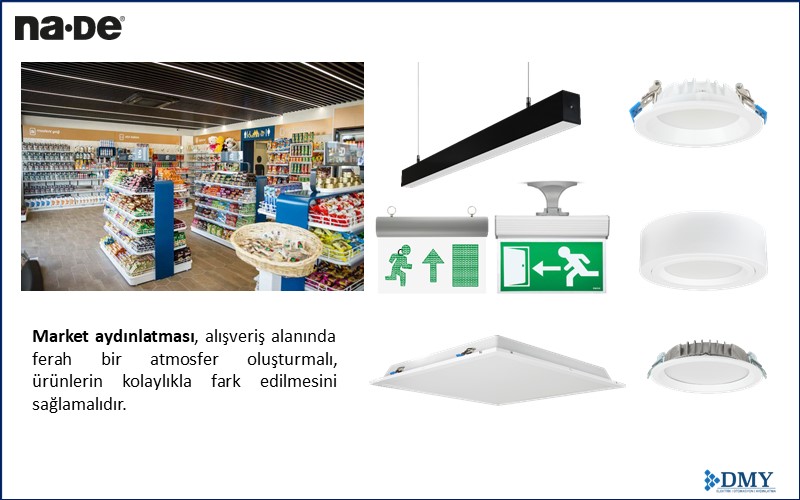 Market aydınlatması, alışveriş alanında ferah bir atmosfer oluşturmalı, ürünlerin kolaylıkla fark edilmesini sağlamalıdır.