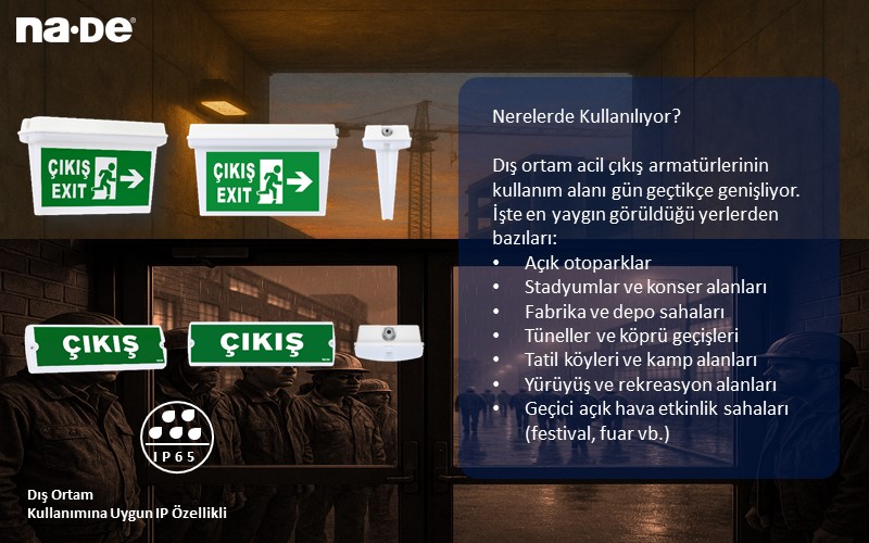 Bu ürünler artık binalarla sınırlı kalmayıp parklar, otoparklar, açık hava tesisleri ve endüstriyel alanlar için geliştirilen dış ortam acil çıkış armatürleri ile can güvenliğinde yeni bir bakış getiriyor.