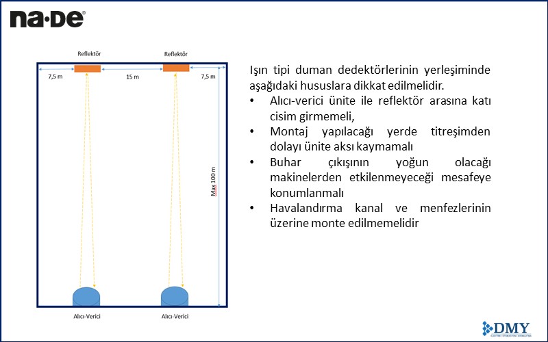 Dedektörler, sağdan ve soldan 7,5 metre boşluk bırakacak şekilde yerleştirilmelidir. Alıcı-verici ile reflektör arasındaki mesafe en fazla 100 metre olabilir. Ayrıca alıcı-verici ünitenin hem yangın hattına bağlanması hem de harici besleme alması gerektiği unutulmamalıdır.