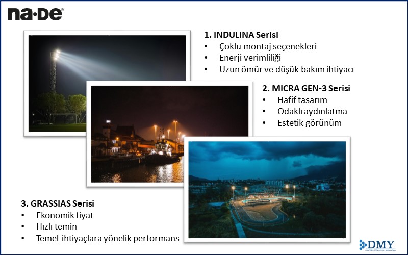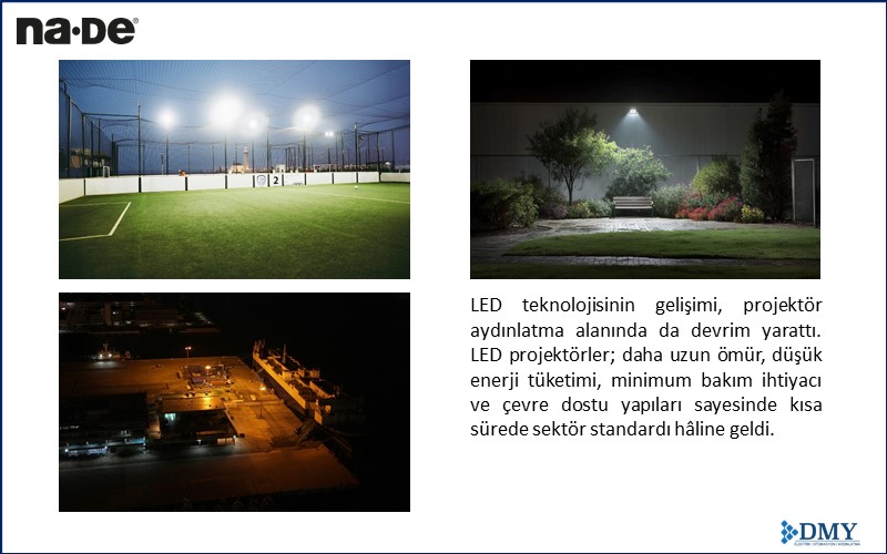 Na·De markasının başarısı, DMY Elektrik Otomasyon Aydınlatma bünyesindeki güçlü Ar-Ge kültürüne dayanır. Yenilikçi çözümler geliştirerek hem yerli hem de küresel pazarlara hitap eden marka, estetik ve fonksiyonel kaliteyi bir araya getirir. Halı sahadan limana, fabrikadan otoparka kadar enerji verimli, dayanıklı projektör çözümleri sunmaktadır.