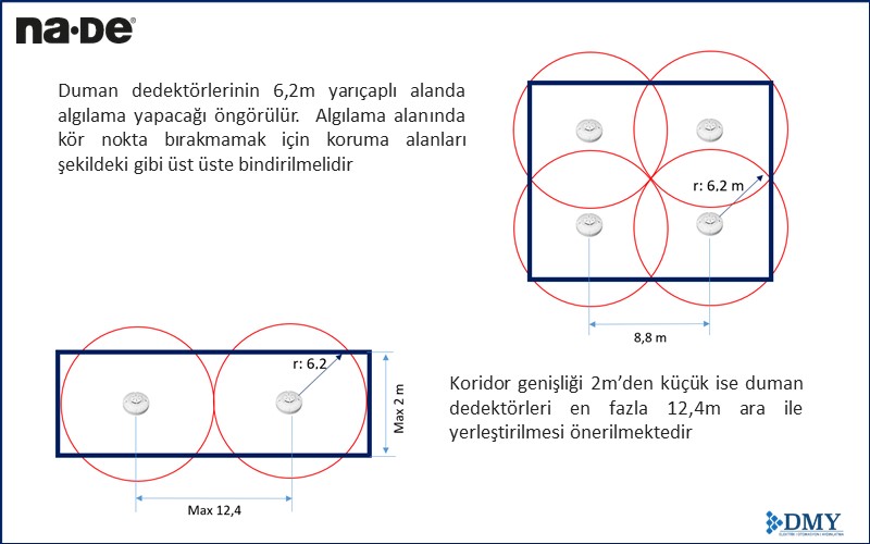 TS CEN/TS 54-14 standardında, dedektörler 6,2 metre yarıçaplı alanda algılama yapacak şekilde planlanmalıdır. Koridor genişliği 2 metre’den küçükse, dedektörler en fazla 12,4 metre aralıklarla yerleştirilmelidir.