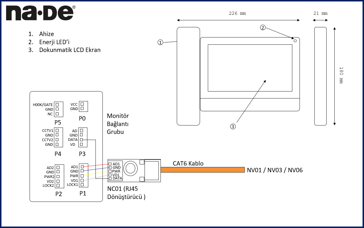 | · 7" Yüksek çözünürlüklü dokunmatik LCD ekran | · Maksimum 3 slave monitör, 2 kapı istasyonu ve 2 CCTV Desteği |