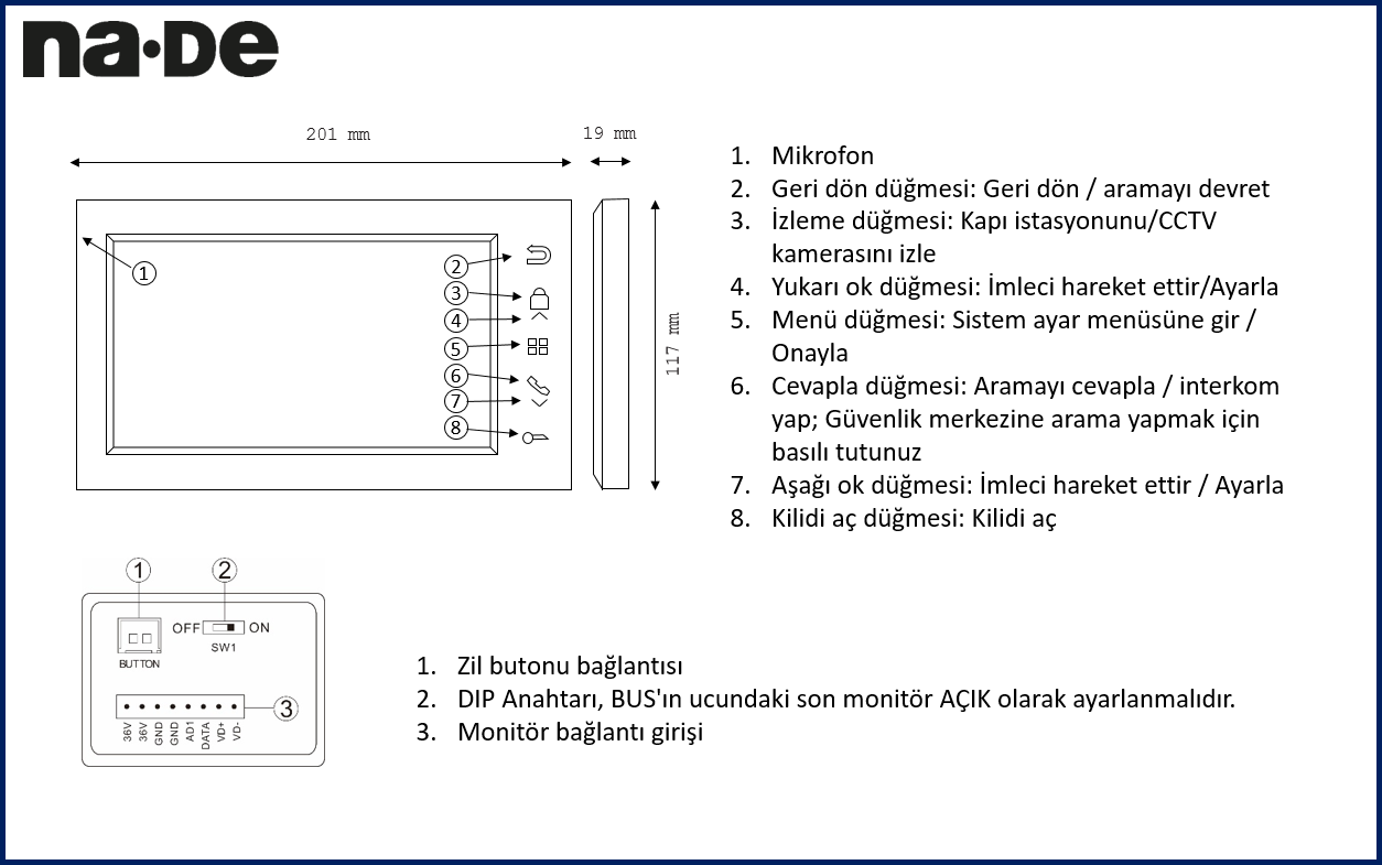 | • | Daireler arası görüşebilme | • | Kolay montaj ve kablo bağlantısı |