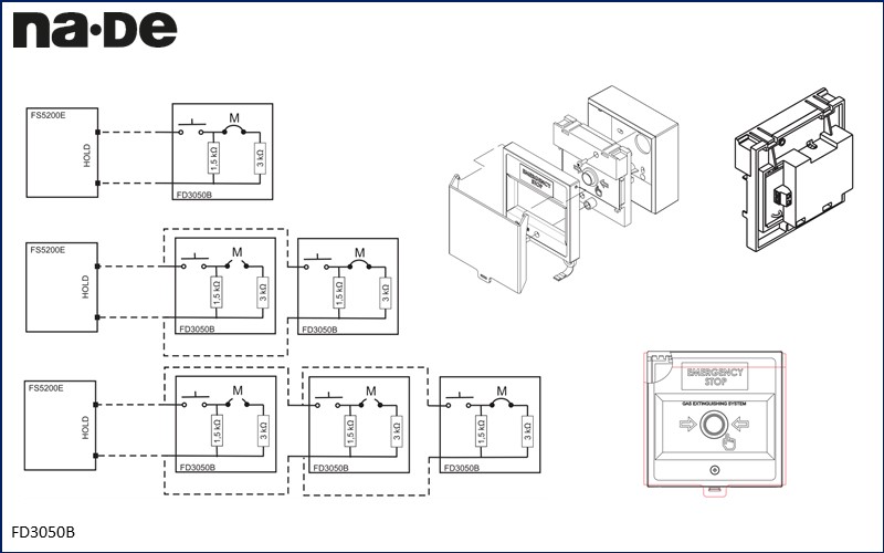 FD3050B Acil Stop Butonu, FS5200E Kontrol Paneli ile birlikte çalışır ve söndürme işlemini tutarak tahliye süresini uzatır. Söndürme yapılacak nesnenin yakınına monte edilmelidir.