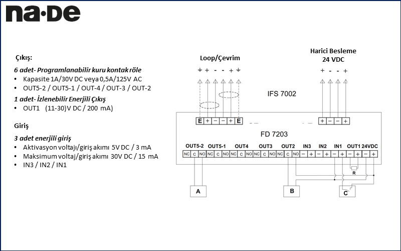 FD7203 Adresli İzolatörlü Giriş Çıkış Modülü ( 3/66) , yangın algılama sistemi ile çevre birimlerin entegrasyonları için kullanılır. 3 Giriş, 6 Çıkış özelliklidir. Harici 24V DC besleme gereklidir.